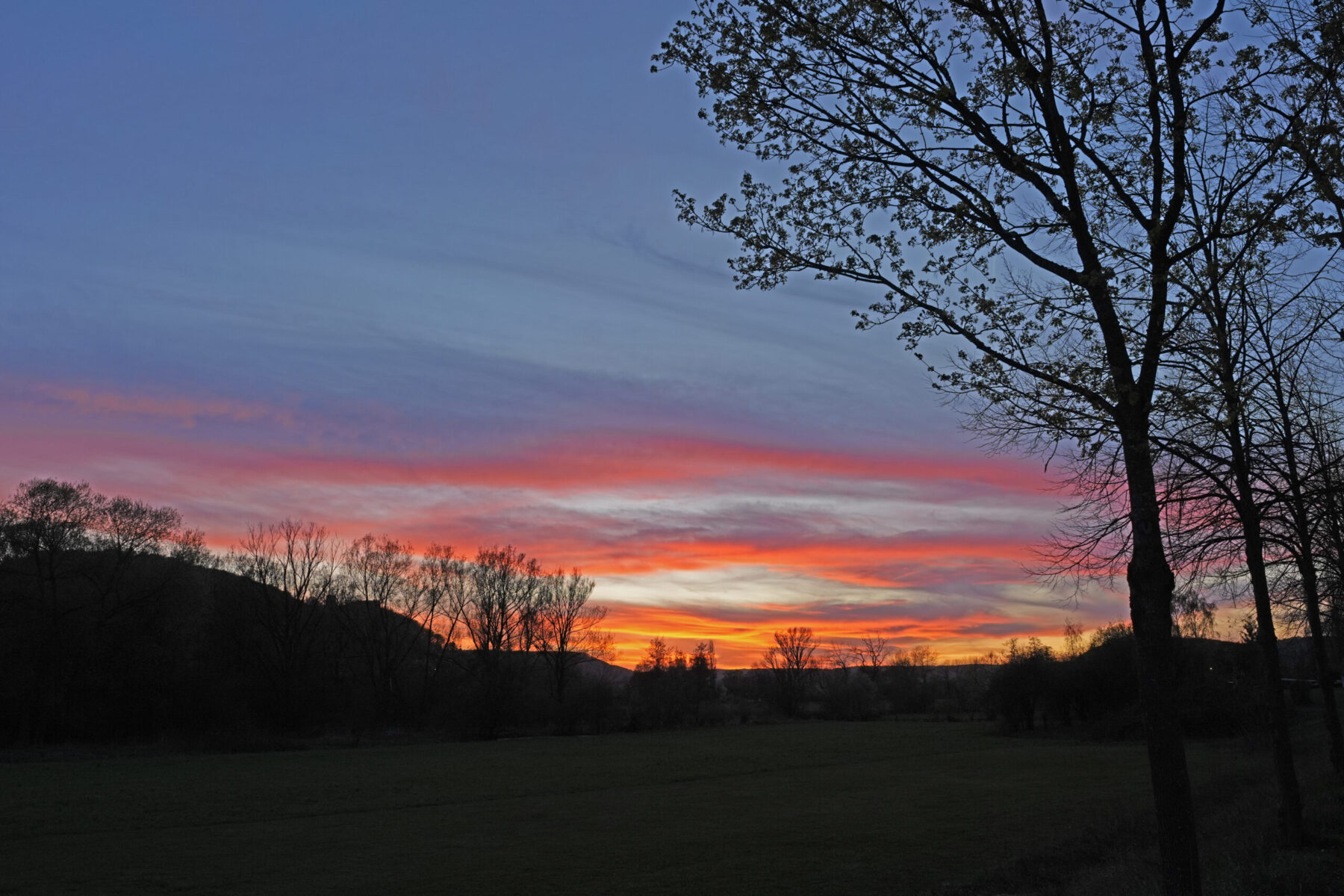 Als ich abends die Bilder im Büro sichte, fällt mein Blick aus dem Fenster und ich sehe einen Sonnenuntergang, den ich mir nicht entgehen lassen kann. Es sind ja nur ein paar Schritte ins Tal der fränkischen Saale.