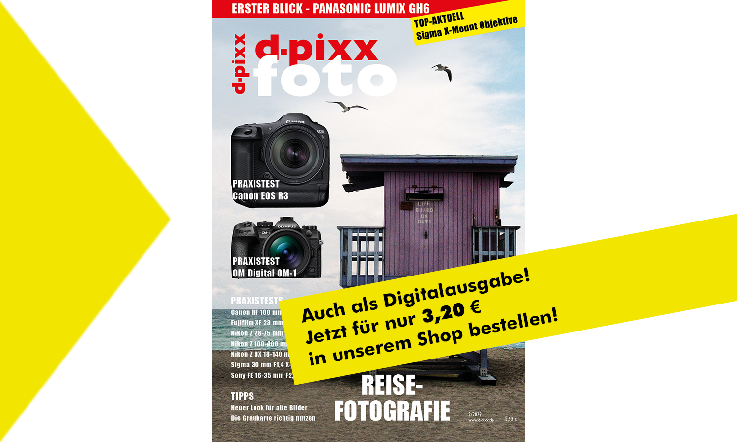 Passend zum anstehenden Sommer, ist das große Titelthema der d-pixx 02/2022 die Reisefotografie. Dabei nehmen wir unsere Leser mit nach Capri, Kambodscha, Venedig, Barcelona, Mallorca, beschäftigen uns mit Standtlandschaften oder besteigen die Hurtigruten. Passend dazu, gibt es natürlich jeweils die besten Tipps und Tricks.